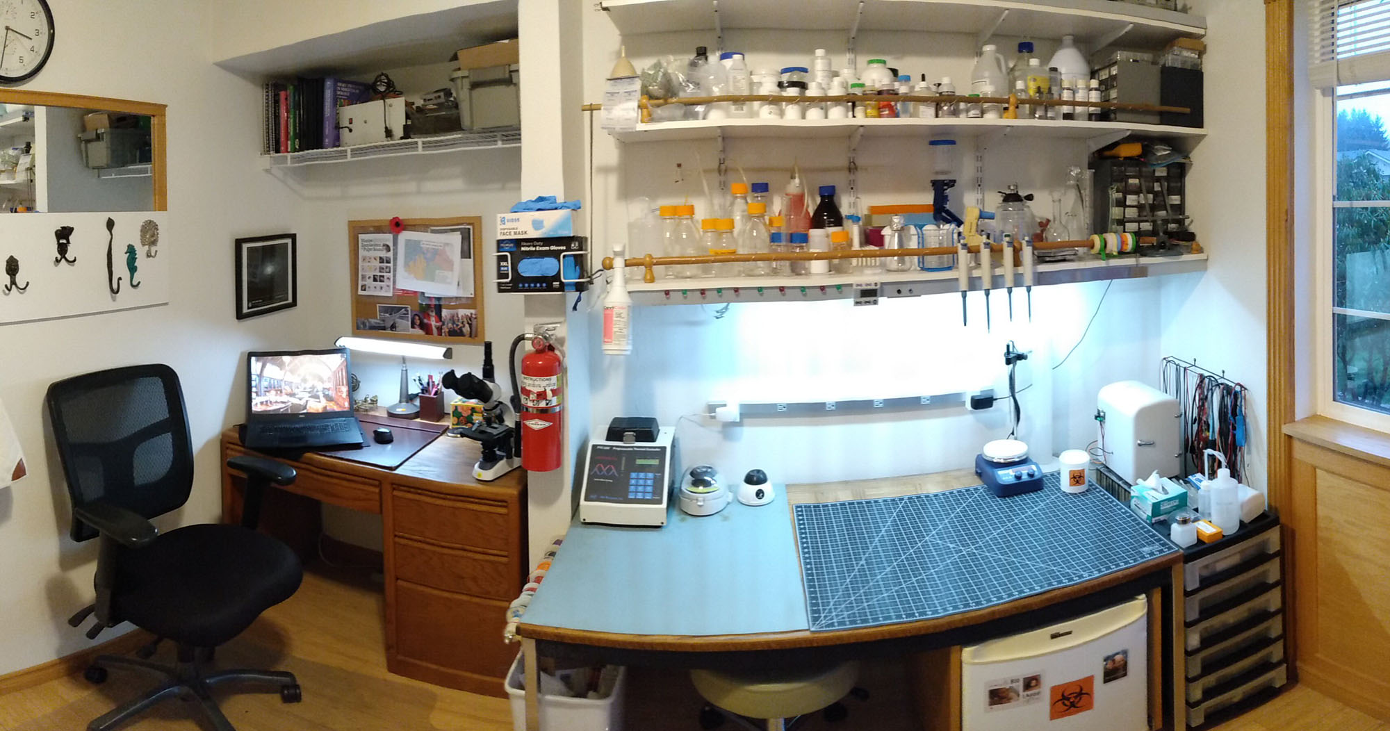 I figure that for every hour I spend seated on the lab stool in a lab coat, I spend 6 hours reading (and re-reading), 2 hours writing in my notebooks at the desk and another hour pounding my head against the white board trying to figure out why my experiments failed.