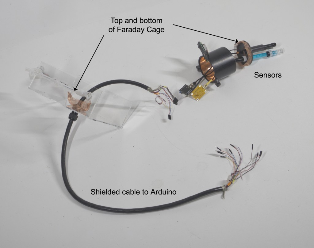 The inside of the 4″ ABS sensor block is lined with copper tape which will be grounded to act as sheilding from any outside interference with the signal. The amplified signal is then fed to an Arduino MEGA by a shielded cable wich is also grounded.