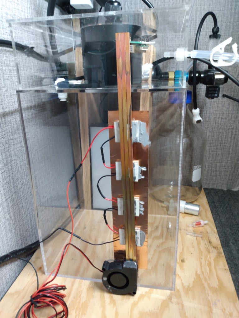 The experiment is done in a rack in my garage. That gives me some ability to limit stray light and keeps it cool enough that my peltier cooler doesn’t have to work too hard.