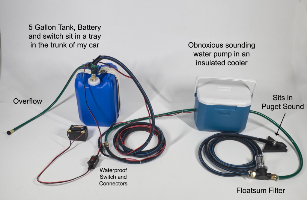 In order to get the same sea water as the meadows, I built this system for pumping 5 gallons of sea water into a tank that’s strapped into the back of my Volkswagon Beetle. The setup should take no more than 5 minutes and the pump is advertised to pump 1 Gallon per minute.